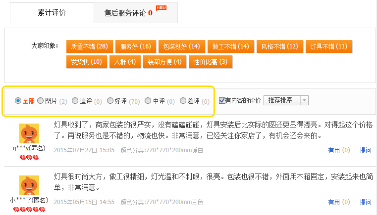 「累计评论(累計評論)」の中には幾つかのボタンがあり、それぞれをクリックすると、他の利用者の評価が見られます。店舗や商品紹介に書かれていない情報も載っていて、大変参考になります。是非翻訳ソフトで翻訳してみてください。