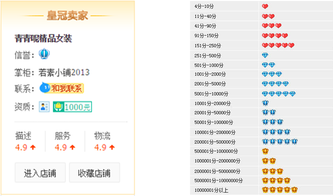 このお店は「信誉」のところに輝くクラウンが付いています。取引回数が多く、実績のあるお店の証です。お客様から「好評」をもらうと、評価が1つ上がります。「差評」と評価されると、評価が1つ下がります。評価の変化に伴って、アイコンが以下のように変わります。