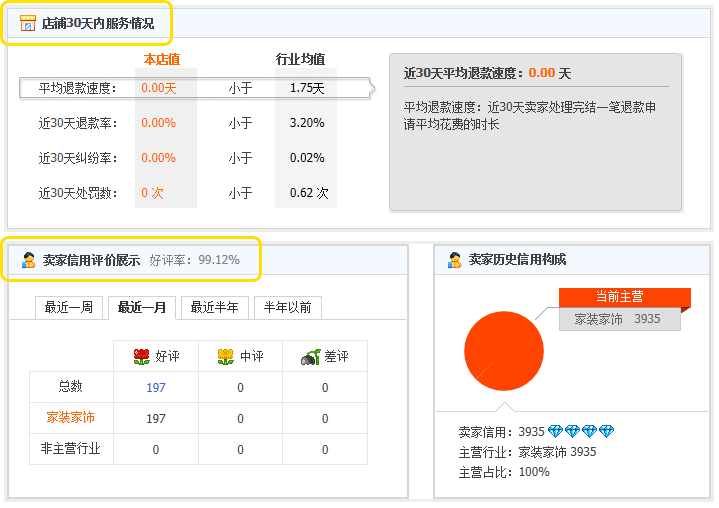 「店铺半年内动态评分」の下には、「店铺30天内服务情况」という直近30日間の評価状況をまとめたものがあります。その下には一週間以内、