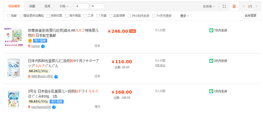 検索バーに「粉ミルク」と入力すると、次の商品が出てきます。